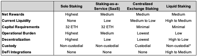 Source: GSR. Note: This table is a generalization. There are many different providers across SaaS, liquid staking, and centralized exchanges, all with distinct terms and conditions. Additionally, there can be overlap between categories, further complicating categorizations. Hence, this table aims to generalize the tradeoffs broadly across categories. *Liquid staking solutions are typically non-custodial, but there are caveats with Coinbase and other LSDs issued by exchanges.