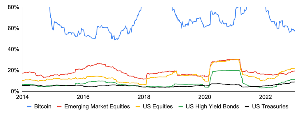 Such volatility, we contend, is due to two reasons, with the first related to the visibility and certainty of future cash flows. In its purest sense, an asset is worth the present value of its future cash flows, and different asset classes have very different certainty and predictability of such cash flows. On one side of the spectrum are assets with near-certain future cash flows, such as a US Treasury, while on the other side are assets with extremely difficult-to-predict future cash flows, such as an emerging tech company or seed stage startup. Assets on the former side of the spectrum will see cash flow expectations change little, making their price much less volatile, while assets on the latter side will often see cash flow expectations change drastically, leading to large price swings. Crypto fits squarely on the latter side of the spectrum, leading to its greater volatility.