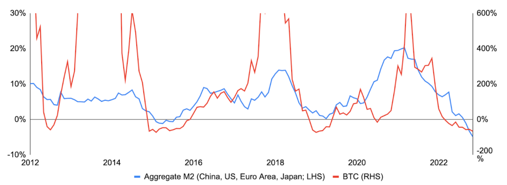 Source: The People’s Bank of China, Federal Reserve, European Central Bank, Bank of Japan, Investing.com, Glassnode, GSR. Note: Converts local currency M2 to US dollars and aggregates before taking year-over-year growth. Note that different countries may define M2 slightly differently, but the general concept of M2 is that of a measure of the money supply that includes cash, checking deposits, and non-cash assets that can easily be converted into cash.