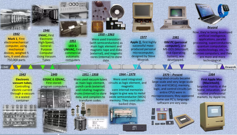 Corporate (Mainframe) Computers: Mainframes are large computers used by organizations for critical applications like data and transaction processing. Many consider the start of the mainframe era to be Howard Aiken / IBM’s 1944 The Harvard Mark 1, which was mostly mechanical, consisted of ~750,000 separate parts, weighed roughly five tons, and utilized a system of punch cards to very slowly compute basic math. Over the coming decades, the underlying technology and functionality rapidly improved. For example, the vacuum-powered ABC computer eschewed physically moving parts to become the first electronic computer in 1941. The ENIAC became the first general-purpose electronic digital computer in 1945, allowing it to solve a large class of numerical problems. Other notable advances include: transistors functioned as electronic switches and replaced the vacuum tube in 1947, the EDVAC used the binary system to improve efficiency and introduced storing programs to memory in 1949, and the UNIVAC became the first commercially available computer in 1951. Today, with large amounts of memory and processors to handle millions of transactions/large-scale batch computing, mainframe computers are in widespread use by corporate entities, powering the global finance industry and much of global commerce.