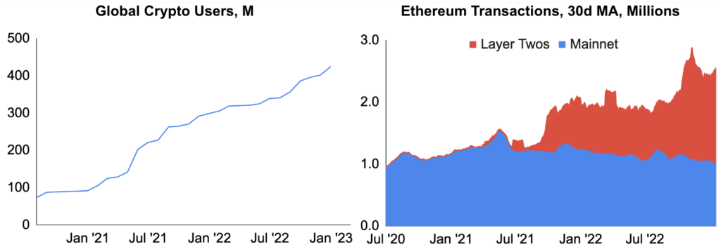 Adoption and usage remain robust, with the number of global crypto users up ~40% over the course of 2022 and the number of Ethereum wallets up 21% over the year. And while the number of transactions and active addresses on Ethereum mainnet have indeed fallen, they have hung in remarkably well relative to price, and we contend that much of the activity has moved to layer twos. In fact, the total number of transactions in the Ethereum ecosystem, which adds mainnet and layer two transaction counts together, increased over 30% from 4Q21 to 4Q22.