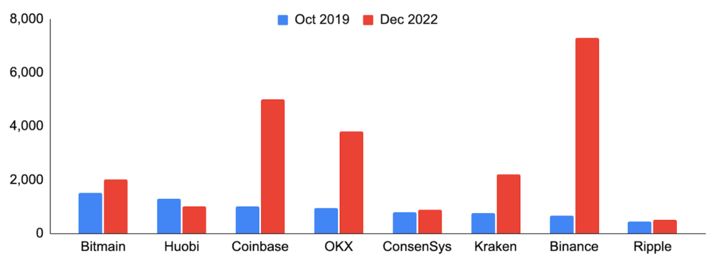 Despite the frequent over-hiring of 2021 and more recent well-publicized layoffs, the influx of talent into the industry has been immense. Crypto job posts on LinkedIn, for example, increased 400% in 2021 over 2020. And The Block tallied industry employment to be ~82,000 employees at firms it tracks as of December 2022, up from ~18,000 in late 2019 for a nearly 5x increase in just three years. The estimated 9,500 layoffs in 2022 are certainly painful, and recent net employment gains in the space are likely negative, though some crypto companies continue to hire, such as Binance and Polygon, and employment levels remain leaps and bounds ahead of where they had been.