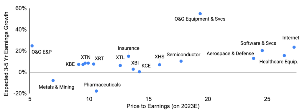 Source: SSGA, GSR. Note: Data as of January 20, 2023. We use the following SPDR S&P industry ETFs: Oil & Gas Equipment & Services (XES), Oil & Gas Exploration & Production (XOP), Internet (XWEB), Software & Services (XSW), Healthcare Equipment (XHE), Insurance (KIE), Aerospace & Defense (XAR), Semiconductor (XSD), Homebuilders (XHB), Regional Banking (KRE), Retail (XRT), Bank (KBE), Transportation (XTN), Health Care Services (XHS), Telecom (XTL), Biotech (XBI), Capital Markets (KCE), Metals & Mining (XME), and Pharmaceuticals (XPH).
