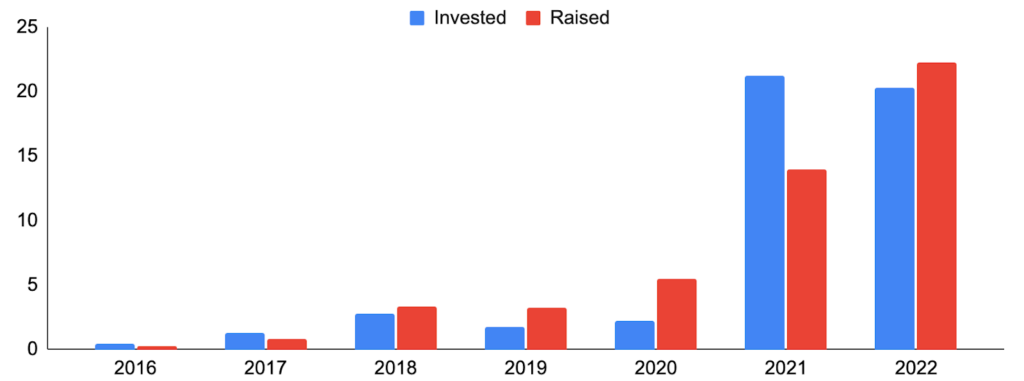 Source: Pitchbook, GSR. Note: Total crypto venture funding for 2022 is through December 10, 2022. Crypto venture funds invested and raised may not be perfectly comparable.