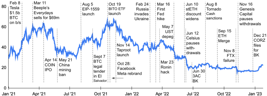 As tradfi converts, we have received nonstop DMs from former colleagues proclaiming, sometimes triumphantly, the death of crypto. After the debacle of a year that 2022 was and with consideration for the astute possibility that they may indeed be correct, we felt it the perfect time for reflection. In what follows, we examine the drivers behind recent price action. We then employ various blockchain/crypto analyses and indicators such as its use cases and benefits, mental models, long-term trends, key challenges, and areas of particular hope to analyze where the industry stands and what may lie ahead.
