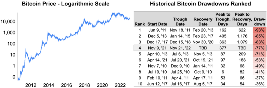 Examining historical price moves puts the current decline in perspective and makes it appear somewhat pedestrian. Putting bitcoin’s price on a logarithmic scale displays percentage changes in a linear fashion, representing percentage changes equally regardless of price (i.e., a move from $10 to $50 appears the same as a move from $10,000 to $50,000), with such charts more appropriate for displaying long-term trends and exponentially increasing data series. While the latest downturn is certainly notable, it does not stick out as catastrophic in the context of bitcoin’s full history. And while it may feel worse going from $67,500 in November 2021 to ~$22,500 currently, the move is not too dissimilar to when bitcoin went from $732 to $321 in 2014. In fact, the 77% drawdown from bitcoin’s local peak on November 9, 2021 to its local trough on November 21, 2022 doesn’t even rank in its top three drawdowns, which are the 93%, 85%, and 83% drawdowns that occurred largely in 2011, 2014, and 2018.