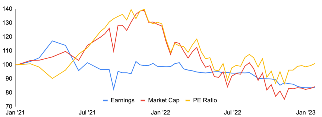 While crypto sentiment and price are interdependent (is price down because sentiment has fallen or has sentiment fallen because price is down?), we can examine more mature businesses with more easily aggregatable earnings, such as the US software industry, to determine reasons for changes in price. As denoted by the blue line below, the software industry experienced steadily declining earnings throughout 2021, though its price, driven by gradual multiple expansion throughout the year, continued to increase. And with no change in rate expectations for the vast majority of the year, we can conclude that such price action was driven primarily by increasingly positive sentiment as investors awarded a higher multiple to the declining earnings stream. As another fast-growing area of technology, we highly suspect that extensive sentiment-driven multiple expansion drove 2021’s phenomenal price increases. Put another way, the underlying technology and potential for what cryptocurrencies may become did not triple in 2021, like the total crypto market cap did, but by the same logic, it did not regress by two-thirds as suggested by 2022 price performance.