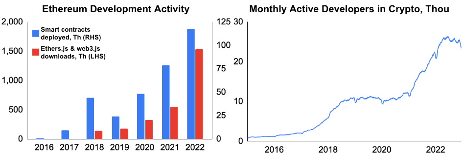 In addition and despite the bear market, underlying technological development continues at a rapid pace. Ethereum, for example, had 48% more development-related events in its public GitHub repository during 4Q22 compared to 4Q21. Further, average weekly downloads of Ethers.js and Web3.js, essential tools for building web3 products, increased nearly 3x in 2022 from 2021, and the number of verified smart contracts increased by 50% over the prior year. Perhaps most importantly, the number of full-time crypto developers increased 8% year-over-year as of January 2023.