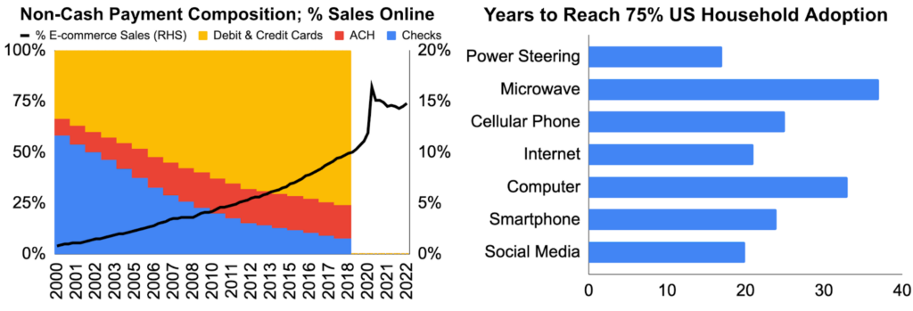 That said, if history is any guide, it was always to be a long path towards changing the world, as shifts in consumer behavior and technology adoption take decades to play out. For example, many consumers still use checks rather than credit and debit cards or buy items in physical stores rather than online. It similarly takes years for new technologies to garner mass adoption and resemble their final form, such as with the microwave taking 37 years from its invention until it achieved widespread household use and the internet taking 22 years from the time it was first made commercially available until 75% of US households had access. The good news is that changes in consumer behavior and technology adoption, though slow, are incredibly steady. And with crypto just seven years from the launch of Ethereum, it is clearly both very early and well on its way.