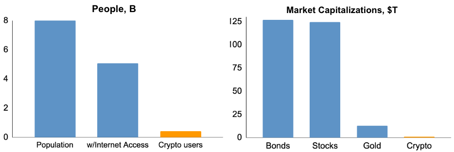 With the potential to impact how we work and earn a living, socialize and interact with others, acquire goods and services, and many more, the opportunity is massive. The 425m crypto users today represent just 5% of the global population and just 8% of those with internet access, a far cry from the potential upside scenario of ubiquity. And from a financial perspective, the total cryptocurrency market cap represents just 0.8% that of both equities and bonds, providing immense potential that includes the possible tokenization of the other asset classes.
