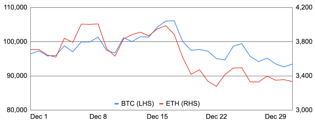 Bitcoin entered December around $96,500 and fell 3% during the month to $93,500. However, this was not before Bitcoin broke $100,000 for the first time on December 5th, a monumental accomplishment that coincided with its market cap surpassing $2T for the first time and placing it as the world’s seventh largest asset behind Google and Amazon. Bitcoin further climbed higher on rising enthusiasm for a US strategic Bitcoin reserve, pushing Bitcoin to a new all-time high of $108,135 on December 17th before a hawkish FOMC meeting reset expectations for Fed rate cuts in 2025 and weighed on crypto prices. In addition to the Fed, there were various negative items during the month, including Mt Gox transferring $2.8b of BTC to an unknown address, the US government transferring $1.9b of seized Silk Road BTC to Coinbase Prime, El Salvador softening its Bitcoin activities to secure an IMF loan, BlackRock stating that there is “no guarantee” Bitcoin’s 21m total supply won’t change, and Google’s new quantum computing chip raising questions about Bitcoin security. Despite this, Bitcoin garnered positive attention from key leaders, including US President-Elect Trump, US Fed Chair Powell, and Russian President Putin, corporates and countries continued to add or explore adding Bitcoin to their balance sheets, and ETF inflows remained stellar at $4.6b during the month. Lastly, Bitcoin development continued to flourish, with Stacks launching its sBTC upgrade on mainnet (with deposit-only functionality), Babylon TVL surpassing $5b, and Botanix launching its final testnet prior to its 2025 mainnet launch.