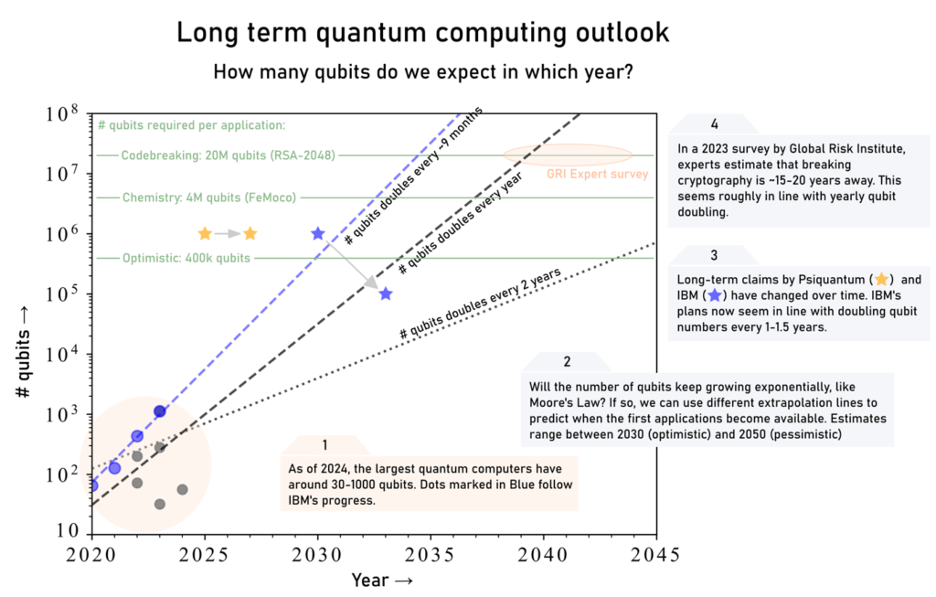 Google announced a breakthrough in quantum computing with its new chip named ‘Willow’, causing concern that Bitcoin and other blockchains may be now vulnerable to having their encryption broken by quantum computers. However, such fears are largely overblown. While Google’s Willow chip represents a genuine breakthrough towards practical quantum computers that could eventually break cryptographic algorithms, most experts believe such systems are still over a decade away. To put things in perspective, Google’s Willow chip is 105 physical qubits in size (where qubits are the quantum computer equivalent to a classical computer’s bits), but breaking quantum-vulnerable cryptographic algorithms is estimated to require quantum computers that have millions or tens of millions of physical qubits. Even under aggressive scaling assumptions equal to or exceeding the pace of Moore’s Law, this size is not expected to be reached until the mid-to-late 2030’s, as shown in the exhibit below.