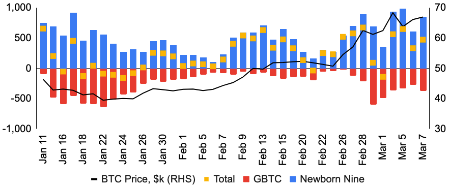 Average daily inflows into the new spot Bitcoin ETFs nearly tripled in February relative to post-launch January. And while much of February’s strength was due to subdued GBTC outflows that weighed much less on total inflows, the other spot ETFs continued to see extremely strong inflows during the month. In fact, total inflows spiked on February 8th and remained at $350m+ for seven straight trading days, helping to lift BTC’s price in the process. And while inflows slowed somewhat after, they came roaring back towards the end of the month, with February 28th’s $673m of inflows setting a new single-day inflows record, beating out day one’s $655m. In addition to flows, trading volume also skyrocketed during the last week of February, hitting $7.7b on the 28th alone.