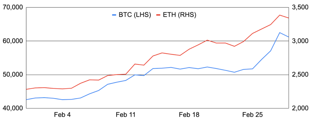 Bitcoin entered February around $42,600 and ended the month at ~$61,200, increasing a whopping 44% for its largest monthly gain since December 2020. Crypto’s apex asset drifted lower to start the month after the Fed expressed caution around near-term rate cuts post the latest FOMC meeting. However, bitcoin rallied as inflows into the spot Bitcoin ETFs picked up on February 8th and remained high for more than a week. Bitcoin’s ascent again paused mid-month as higher-than-expected US inflation pushed out expectations for easing monetary conditions before rallying towards month-end again on particularly strong ETF inflows. By the end of the month Bitcoin had hit new all-time highs in many countries, including China, Japan, the UK, India, Argentina, Turkey, and Egypt, and subsequently reached an all-time high against the US dollar this month before retreating. Elsewhere, innovation on Bitcoin continued as developers pushed to bring back the OP_CAT function and Bitcoin staking protocol Babylon launched on testnet. Bitcoin-focused payments app Strike rolled out services to Africa, while El Salvadorian President Nayib Bukele was reelected. Finally, Bitcoin futures open interest hit an all-time high, a research report found that Bitcoin and Ethereum are immune to 51% attacks, and new, never-before-seen Satoshi emails emerged in court.