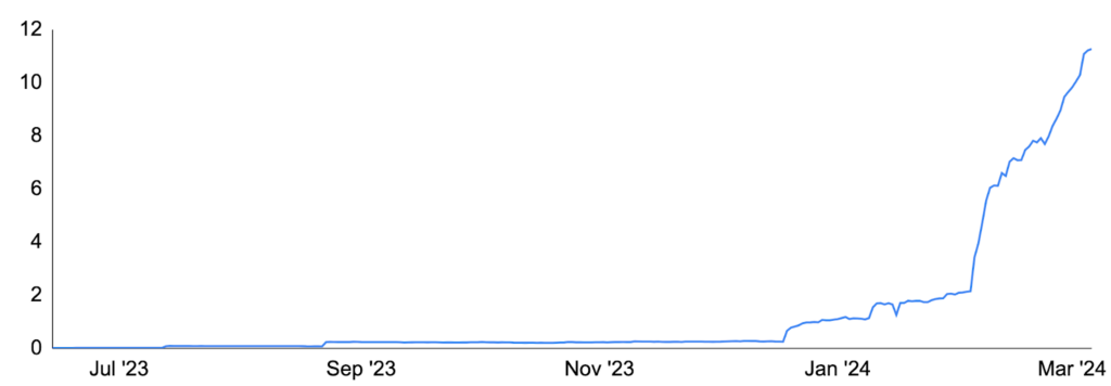 Not to be outdone, Ethereum entered February around $2,300 and rose 46% throughout the month to finish around $3,350. ETH’s price was helped by Bitcoin’s move, and likely also by enthusiasm for a potential spot Ethereum ETF and the forthcoming Dencun upgrade set for March 13th. As a reminder, Dencun features EIP-4844 / proto-danksharding, which will materially expand mainnet’s data availability throughput via data blobs and will likely materially lower costs for L2s. Also during the month, the ETH supply fell by 46,000 ETH, equivalent to -0.5% annually, staking deposits passed 25% of circulating supply for the first time, and Ethereum TVL passed $50b for the first time since May 2022. Also notable was continued progress around client diversity, as Coinbase Cloud announced that it will migrate 50% of its validators from Geth to Nethermind over the next several weeks and will later add support for Erigon, both going a long way in reducing Geth’s execution client market share. In other news, Eigenlayer TVL skyrocketed as it lifted its deposit cap, StarkWare commenced its highly anticipated airdrop, Polygon and StarkWare announced new Circle STARKs and various Optimism-based chains deployed the Delta upgrade.