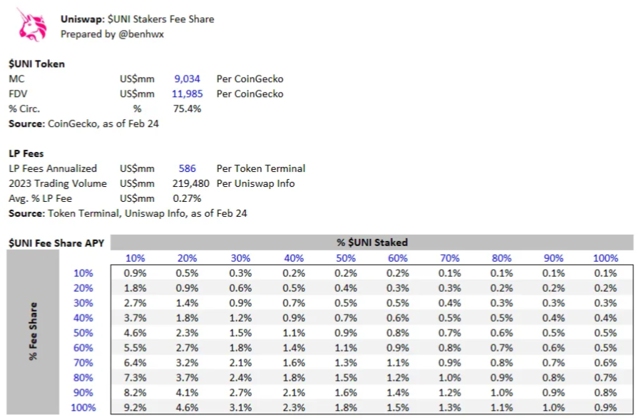 Source: Medium via @benhwx, GSR. Note: Uniswap currently charges LP fees of 0.3% on Uniswap v2 pools and 0.05-1.00% on Uniswap v3 pools. The example above assumes Uniswap inaugurates a 0.05% protocol fee that is shared with UNI stakers and then varies the percentage of UNI staked and the percentage of fees shared. See here for more details.