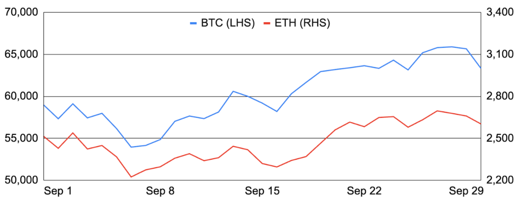 Bitcoin entered September around $59,000 and rose 7% during the month to $63,300. Prices fell to start the month as poor US economic data reignited worries of a US-led slowdown. However, Bitcoin spent the remainder of the month moving higher as central banks enacted accommodative policies, most notably in the US and China and covered more below. During the month, the total Bitcoin network hashrate hit a record, periodically surpassing 750 EH/s, though this helped to push hashprice, which measures the expected value of 1 PH/s of hashing power per day, towards all-time lows. In addition and perhaps in response to August’s WBTC controversy, wrapped bitcoin products remained in the spotlight, with Coinbase launching its cbBTC that is now the second largest wrapped Bitcoin product on Ethereum, and others launching wrapped Bitcoin products like 21Shares or expanding existing wrapped Bitcoin tokens to new dapps or chains like WBTC and tBTC. Lastly, there continued to be considerable development from Bitcoin L2s, including Fractal launching on mainnet after attracting 12m unique addresses, Stacks developers selecting the Nakamoto upgrade hard fork block that’s expected to occur on October 9, and Citrea deploying its BitVM-based Clementine bridge on public testnet.