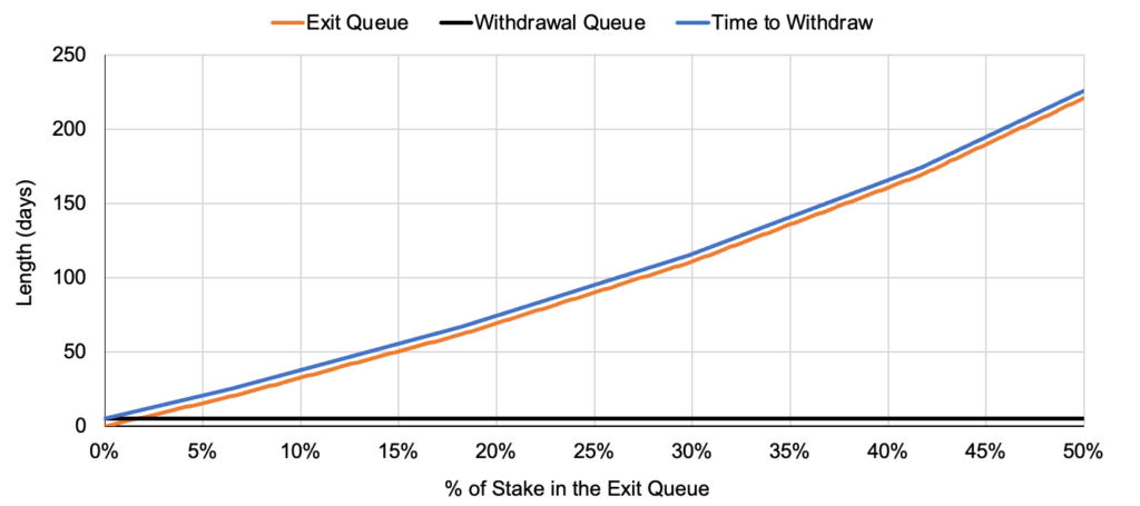 In a hypothetical where all validators have 0x01 credentials, the withdrawal pool functions as a round-robin sweep starting from the oldest validator and incrementing by age (i.e., the validator index number). As a validator reaches the front of the withdrawal queue, the protocol checks if they’ve gone through the exit queue and if the minimum withdrawal delay (~27 hours) has since passed, if so, the validator’s full stake is withdrawn, if not, a partial withdrawal occurs and the excess stake is withdrawn. The withdrawal queue is indifferent between partial or full withdrawals, and it sweeps through the validator set processing 16 withdrawals per block. As a result, partial withdrawals will occur about every ~5 days7, but full withdrawals will take much longer if a large portion of validators try to exit simultaneously given the more constrained exit capacity. Leveraging the per epoch validator churn formula from the previous exhibit, we can estimate the number of days it will take to withdraw depending on one’s estimates for the amount of exiting stake. For example, if 10% of validators try to exit simultaneously, the exit queue will balloon to about 33 days, and it will take closer to 38 days for a staker in the back of the queue to withdraw in full8.