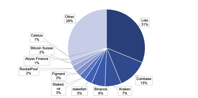 While the percentage of validators that will withdraw in full is difficult to estimate, one can estimate the upper bound on the ETH available due to partial withdrawals. Assuming all validators have 0x01 prefixes for simplicity9, there are ~564k validators with an average account balance of ~34 ETH, meaning ~1.13m of excess ETH staked will be skimmed on a continuous basis over the course of the roughly five days beginning immediately after Shapella. Additionally, ~3,600 validators have already gone through the exit queue and exited as of two days before Shapella, so a small subset of validators in the withdrawal queue will be immediately withdrawing their full stake instead of their excess stake during the first sweep through the withdrawal queue. This adds another ~115k ETH of exit pressure from full withdrawals to the first sweep, but this number will grow as more validators exit10. With validator churn capped at 1,800 validators per day for at least the first three weeks of withdrawals, an incremental ~58k ETH of withdrawals could potentially be added to the total each day (ignoring the de minimis incremental skimming rewards generated between the first sweep and subsequent sweeps). Lastly, just to reiterate, this is simply a model for thinking about the withdrawal parameterization in a tangible way, but it’s certainly an upper-bound estimate. Many validators will need to change their withdrawal credential prefixes to be able to withdraw, and staking service providers complicate matters further as end users may not immediately have access to the withdrawable ETH depending on the service provider’s setup. For example, Lido controls ~31% of all stake, but it will not support withdrawals until some point in May.