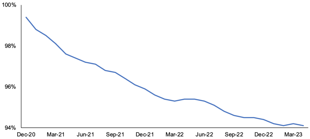 While noting the large degree of uncertainty, our base view is that the peak length of the exit queue is more likely weeks than months, particularly due to the level of stake outsourced to staking service providers that will add support for withdrawals at differing times. Coinbase intends to begin processing withdrawal requests about 24 hours after Shapella, Binance will follow suite “within one week,” Rocket Pool’s withdrawal-enabling Atlas upgrade will occur on April 18th, and Lido will follow later in May11. In addition, it’s important to note that validators concerned about the future length of the exit queue could signal to exit now. At the time of writing, two days before Shapella, the exit queue is empty and any validator could sign a voluntary exit at the expense of forgoing ~$10 of staking rewards. This implies to us that most validators do not have an immediate need for liquidity.