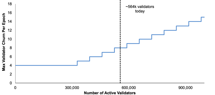 Source: Upgrading Ethereum, GSR. Note: While beyond today’s scope, the formula is as follows: MAX(MIN_PER_EPOCH_CHURN_LIMIT, n / CHURN_LIMIT_QUOTIENT); where n is the number of active validators.