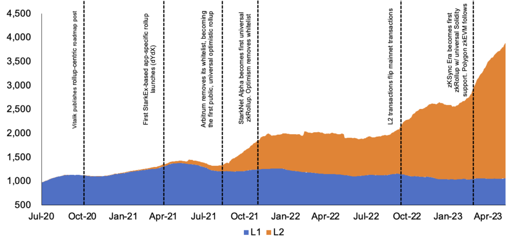With that as background, we can now view Ethereum’s declining mainnet transaction count in a different light. And when adding in L2 transactions, we see that total ecosystem transactions, including those on mainnet and layer 2s, are up a strong 146% over the last two years. Not only does this show that usage of Ethereum continues to increase rapidly, but also that it continues to progress along its roadmap exactly as intended.