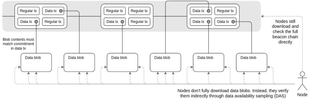While the implementation details of DS are not set in stone, the general idea is simple to understand: DS distributes the job of checking data availability amongst validators. To do so, DS uses a process known as data availability sampling, where it encodes shard data using erasure coding, extending the dataset in a way that mathematically guarantees the availability of the full data set as long as some fixed threshold of samples is available6. DS splits up data into blobs or shards, and every validator will be required to attest to the availability of their assigned shards of data once per epoch, splitting the load amongst them. As long as the majority of validators honestly attest to their data being available, there will be a sufficient number of samples available, and the original data can be reconstructed. In the longer run, private random sampling is expected to allow an individual to guarantee data availability on their own without any validator trust assumptions, but this is challenging to implement and is not expected to be included initially.