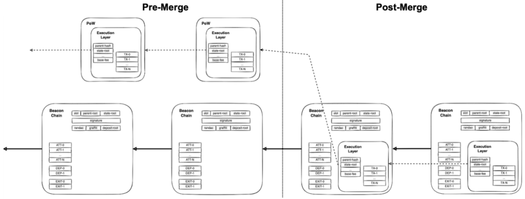 Launched in December 2020 as the first concrete step in Ethereum’s transition to proof-of-stake, the Beacon Chain, also known as the consensus layer, is a distinct proof-of-stake blockchain running in parallel to Ethereum’s proof-of-work mainnet. Perhaps the biggest challenge with The Merge is that Ethereum cannot be easily shut down or paused to implement the upgrade, as it exists not on a centralized server but simultaneously on thousands of computers (nodes) that run one of the open source Ethereum software implementations known as a client. This challenge is perhaps best illustrated by an analogy where Ethereum can be viewed as a spaceship (multiple functional layers – consensus, execution, settlement, data availability) with the Beacon Chain being a newly built engine (consensus), and after substantial testing, The Merge will swap out the spaceship’s engine mid-flight. Hence, the Beacon Chain was launched as an independent blockchain to eventually swap out Ethereum’s existing consensus mechanism while generally retaining the rest of Ethereum’s history and other functionality. This approach allows for live testing while permitting everyday Ethereum users and their assets to remain segregated until developers are comfortable executing The Merge.