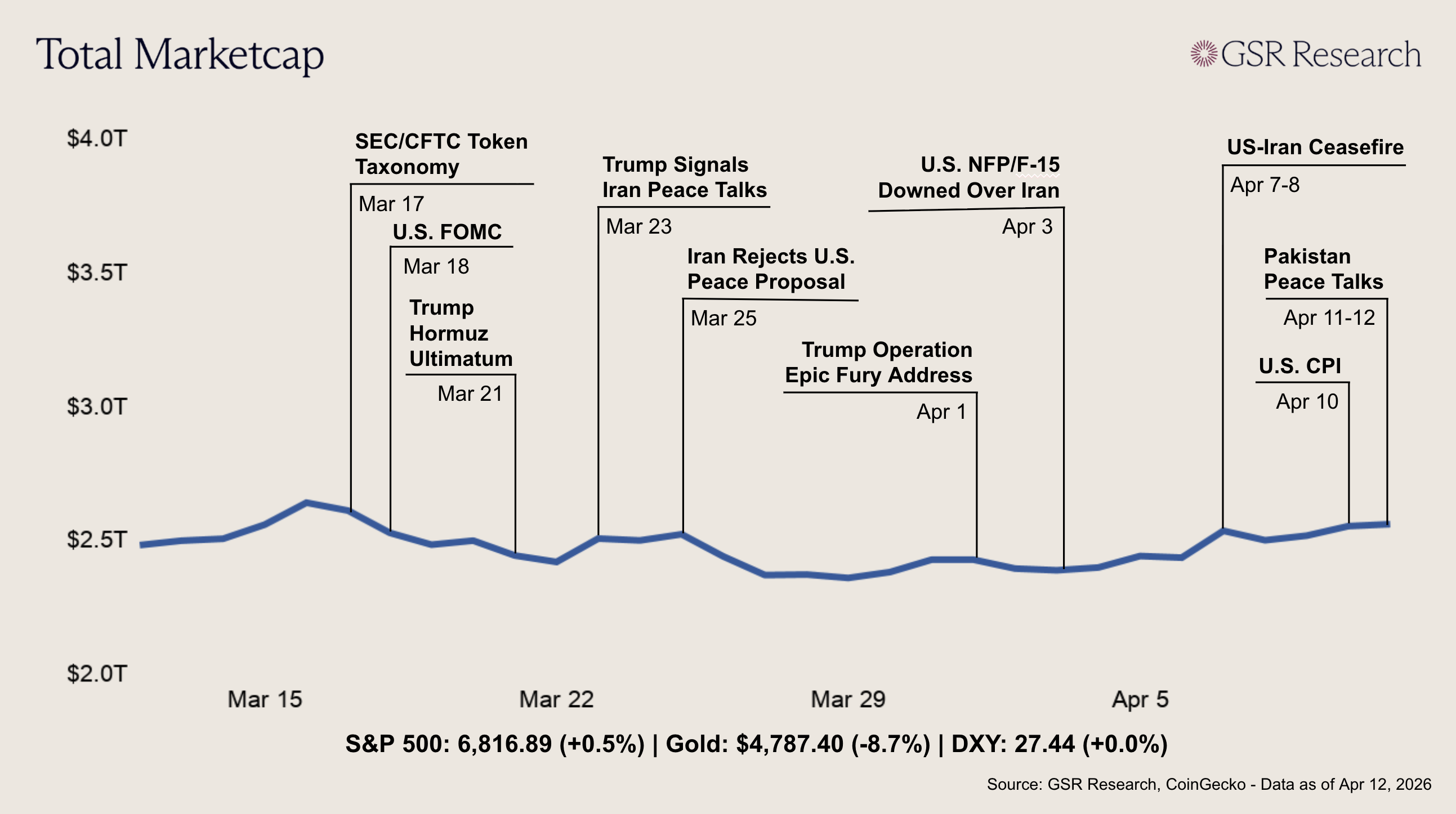 Crypto markets rallied early in the week on ceasefire euphoria before giving back most of the gains over the weekend as peace talks collapsed. The total crypto market cap opened near $2.39T, with BTC around $67,300. The turning point came Tuesday evening when the U.S. and Iran announced a two-week ceasefire brokered by Pakistan's Prime Minister, contingent on Iran reopening the Strait of Hormuz. Risk assets rallied across the board, BTC broke above $70,000 for the first time since March 26 and the S&P 500 gapped higher. Brent crude cratered roughly 15% in a single session to below $92, and the dollar index fell over 1% to a four-week low. However, the ceasefire's credibility was tested within hours as Netanyahu declared Lebanon excluded from the agreement and launched strikes on Hezbollah, prompting Iran to accuse the U.S. and Israel of violating three clauses. Despite the truce, actual Strait transit remained tightly controlled by the IRGC, with only around 17 vessels crossing daily versus roughly 130 before the war. Markets largely looked past the early cracks, and the S&P 500 closed the week at 6,817, up 3.9% for its best performance since November.