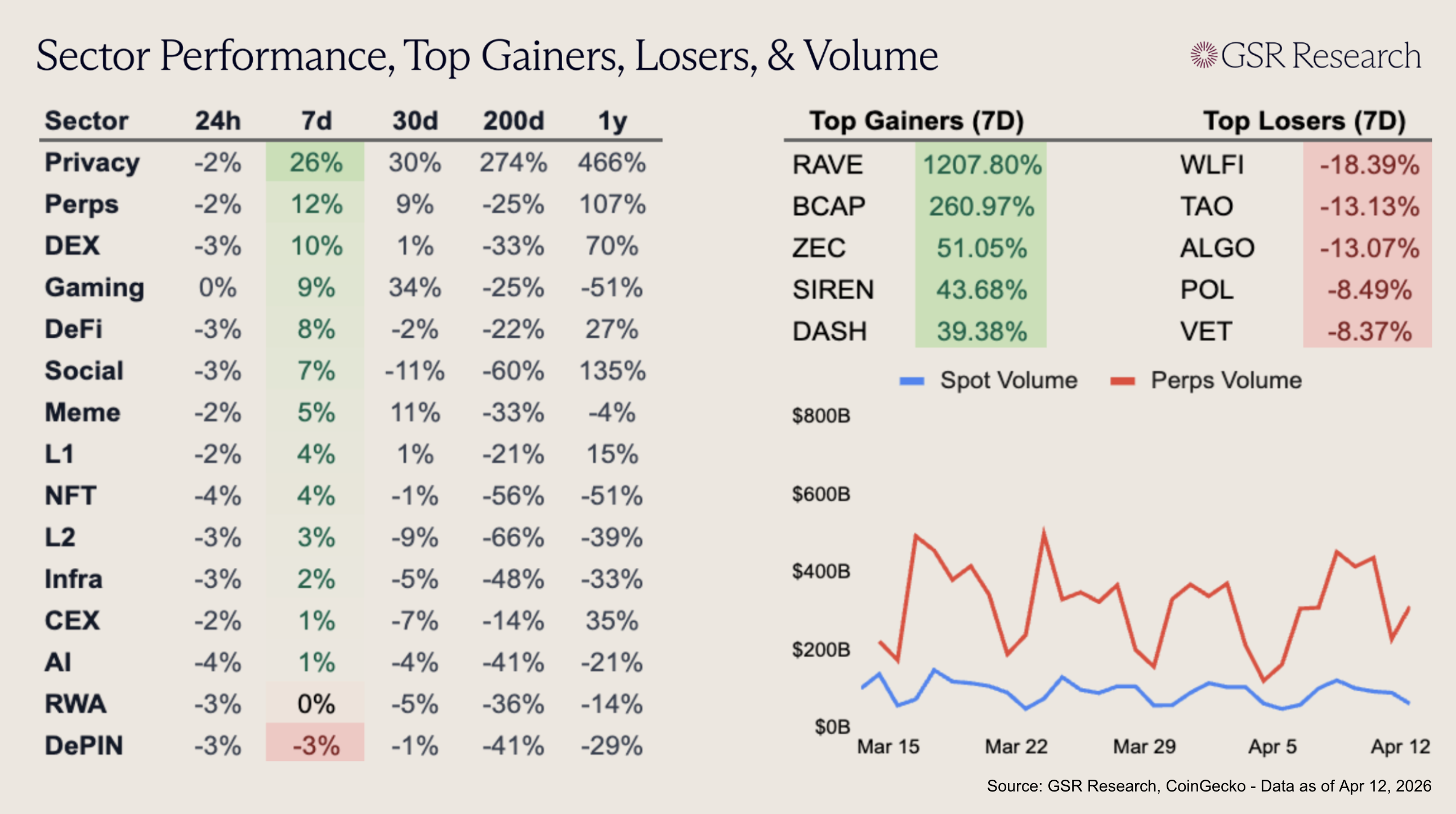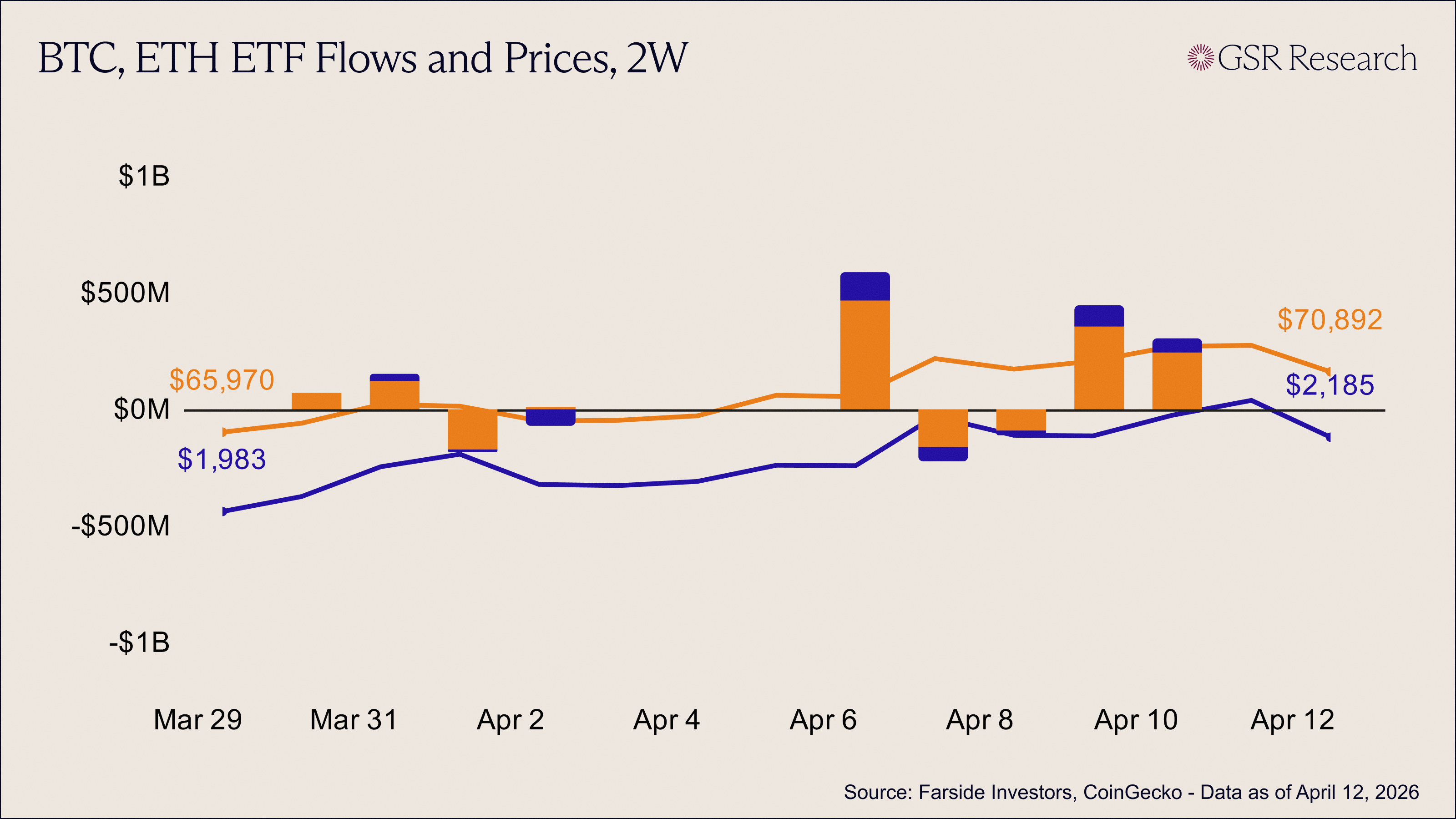 Price action reflected the improving flow backdrop, particularly in the latter half of the week. Bitcoin rallied from $68.9k on Apr 6 to a peak near $73.1k on Apr 11 before pulling back slightly to $70.9k on Apr 12, marking a solid weekly advance before mild profit taking. Ether followed with a similar pattern, climbing from $2,108 to $2,285 at the highs before retracing to $2,185. While both assets benefited from renewed ETF inflows, the late-week pullback suggests that conviction remains somewhat tentative. Still, the ability to reclaim higher levels alongside strong inflow days points to improving market structure after the prior period of sustained outflows.