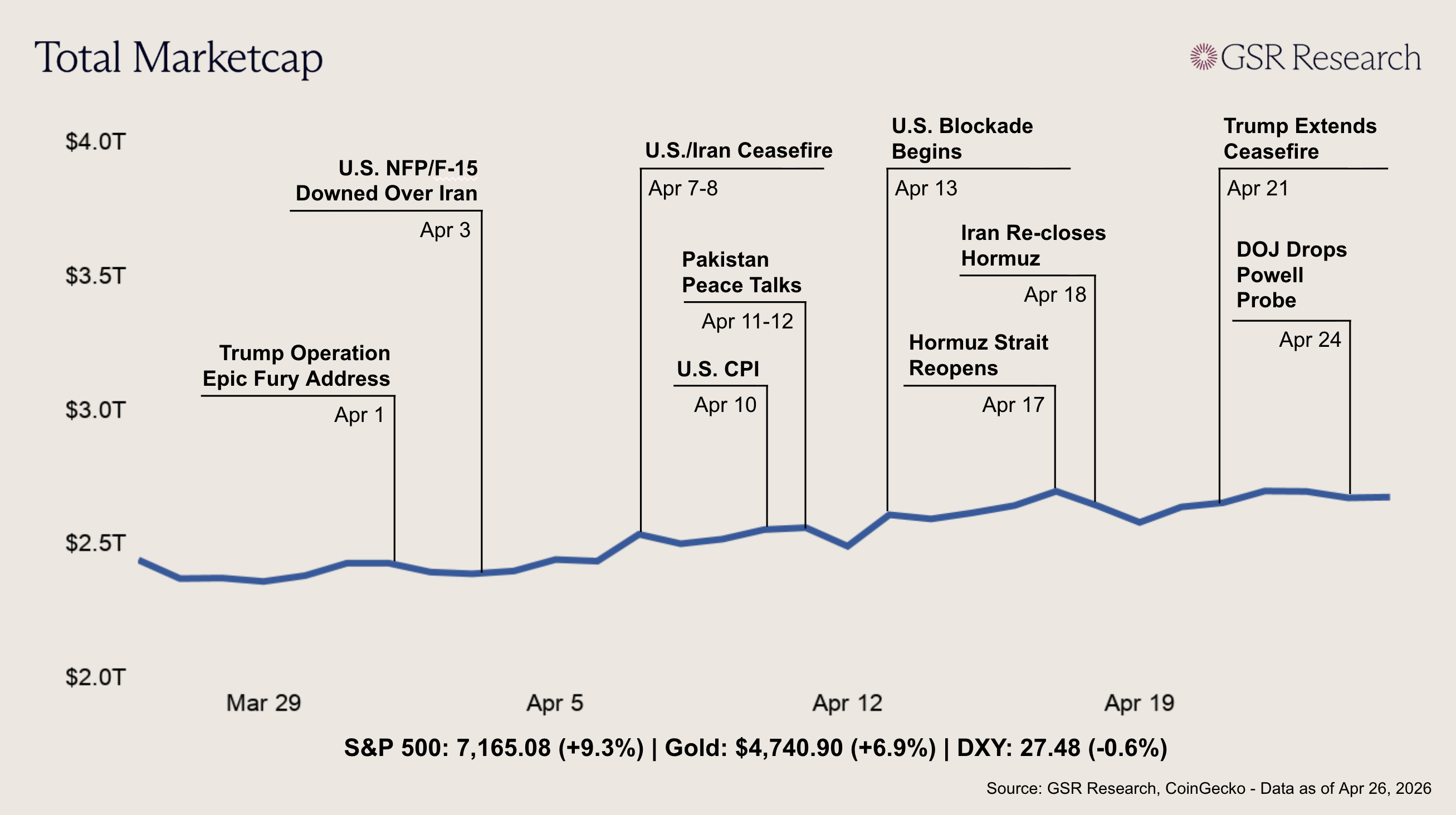The rally cooled briefly Thursday after reports that Iran's parliament speaker had resigned from the negotiating team pushed Brent back above $105. Friday brought the week's most consequential procedural development: U.S. Attorney Jeanine Pirro abandoned the DOJ's criminal probe of Fed Chair Powell, removing the precondition Senator Tillis had set for advancing Kevin Warsh's confirmation. A blowout Intel earnings report (+24%) carried the S&P 500 and Nasdaq to fresh closing records of 7,165 and 24,837. Iran-related friction returned over the weekend after Trump cancelled an envoy trip to Pakistan and Iranian FM Araghchi left Islamabad without meeting U.S. officials, sending Brent to $107 by Sunday. BTC nonetheless held its gains, tagging $79,500 again early Monday before failing at $80,000 and easing back to $77,800. Focus now turns to Wednesday's FOMC decision, Big Tech earnings, and Thursday's Q1 GDP and PCE prints.