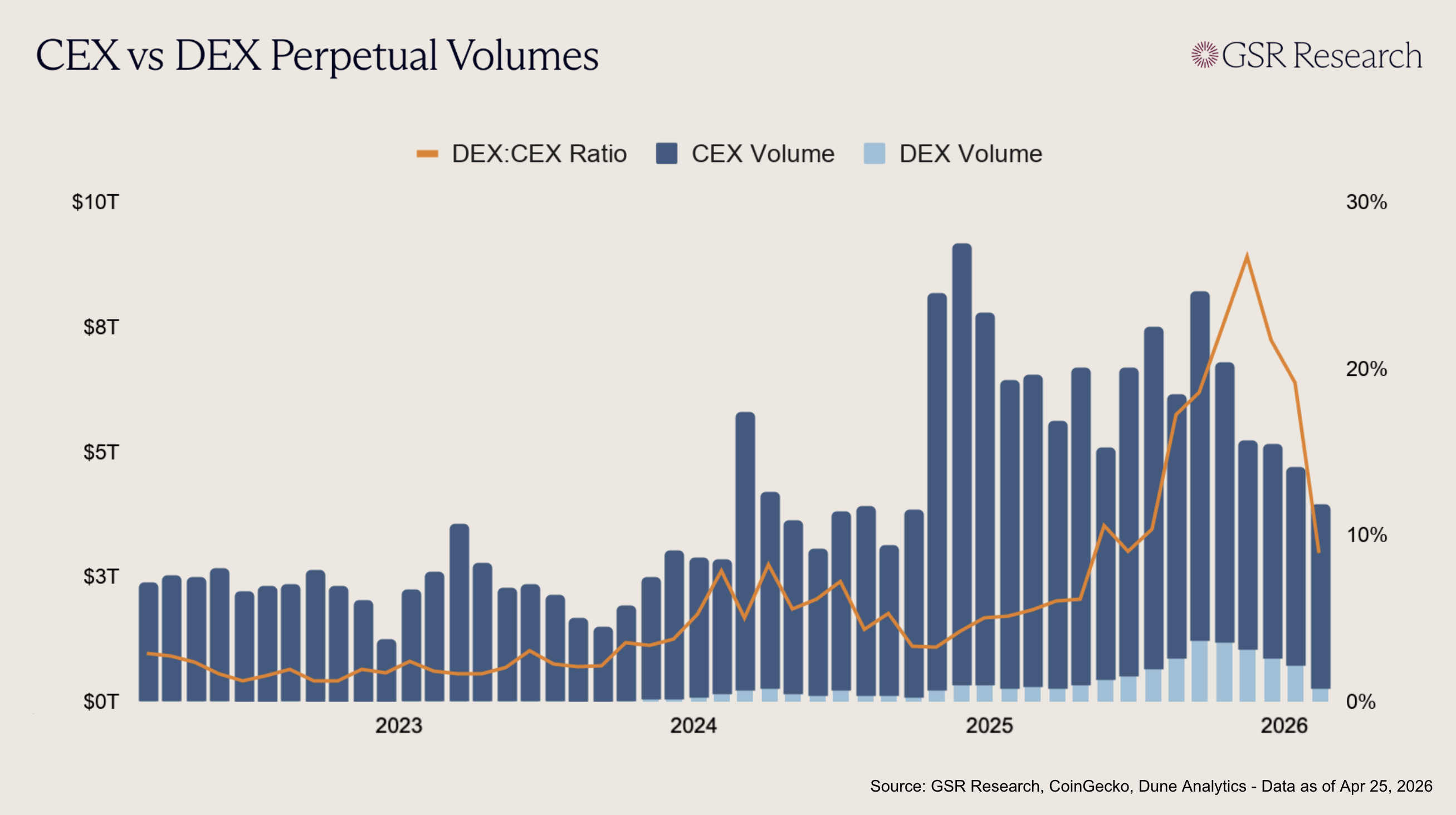 Kalshi and Polymarket are entering perps in the pivotal moment of a larger fight between centralized and decentralized exchanges. While centralized exchanges have dominated perpetual futures ever since their creation by BitMEX in 2016, decentralized platforms have recently been acquiring a higher percentage of total volume, particularly since the launch of Hyperliquid in November 2024. In the year following Hyperliquid’s launch in November 2024, decentralized exchanges would go from doing less than 4% to over 25% of CEX volumes. Decentralized volumes peaked during late 2025 due to attention around token launches for major DEXs like Aster and Lighter, but have since been in a downward trend, with the ratio now sitting under 10% once again. Decentralized exchanges mounted a formidable challenge to the centralized behemoths like Binance, but with volumes crashing post-TGE, their long-term viability is being questioned once again. Now, with the launch of Polymarket and Kalshi perps, as well as Hyperliquid’s upcoming HIP-4 deployment, full-stack CEXs and DEXs will once again compete for the same target userbase. The defining conflict of the next era will be the race between centralized and decentralized exchanges to build the first true "Super-App" of finance.