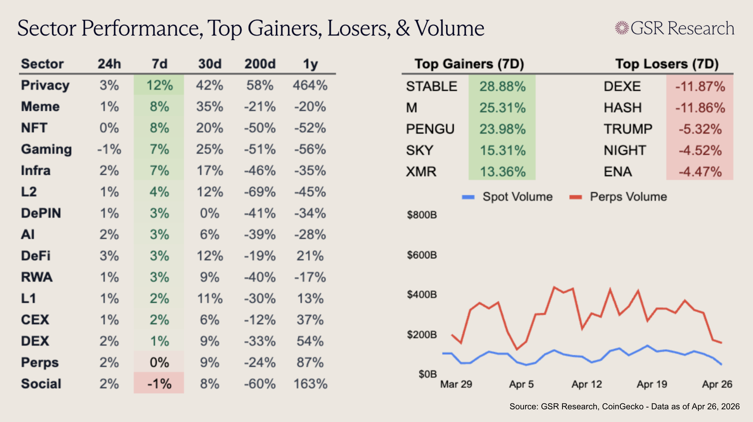 Privacy is the top performing sector on the week, up 12% due to rallies in Monero (+13.36%) and Zcash (+10.4%). Zcash rallied after the privacy-focused L1 secured a Robinhood listing on the 23rd, while Monero surged following the "MoneroRun 2026" community audit, which triggered a supply squeeze as users withdrew their XMR from centralized exchanges into self-custody to celebrate the protocol’s 12th anniversary. The meme, NFT, and gaming sectors have also outperformed on 7d and 30d timelines, defying the perception that their respective narratives have cooled.