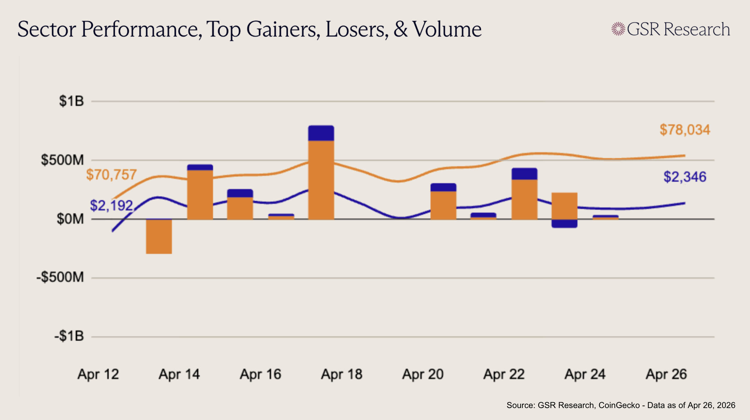 Ether ETFs extended their recent recovery but showed more fragility and variance across sessions. The week opened with solid inflows (+$68M on Apr 20 and +$43M on Apr 21), followed by a strong midweek print (+$96M on Apr 22). However, this momentum was interrupted by a sharp outflow on Apr 23 (-$76M), before partially stabilizing into the end of the week (+$23M on Apr 24). While the aggregate trend remains positive, the choppier profile relative to BTC suggests that ETH demand is still more tactical and less consistent, with flows more sensitive to short-term positioning shifts.