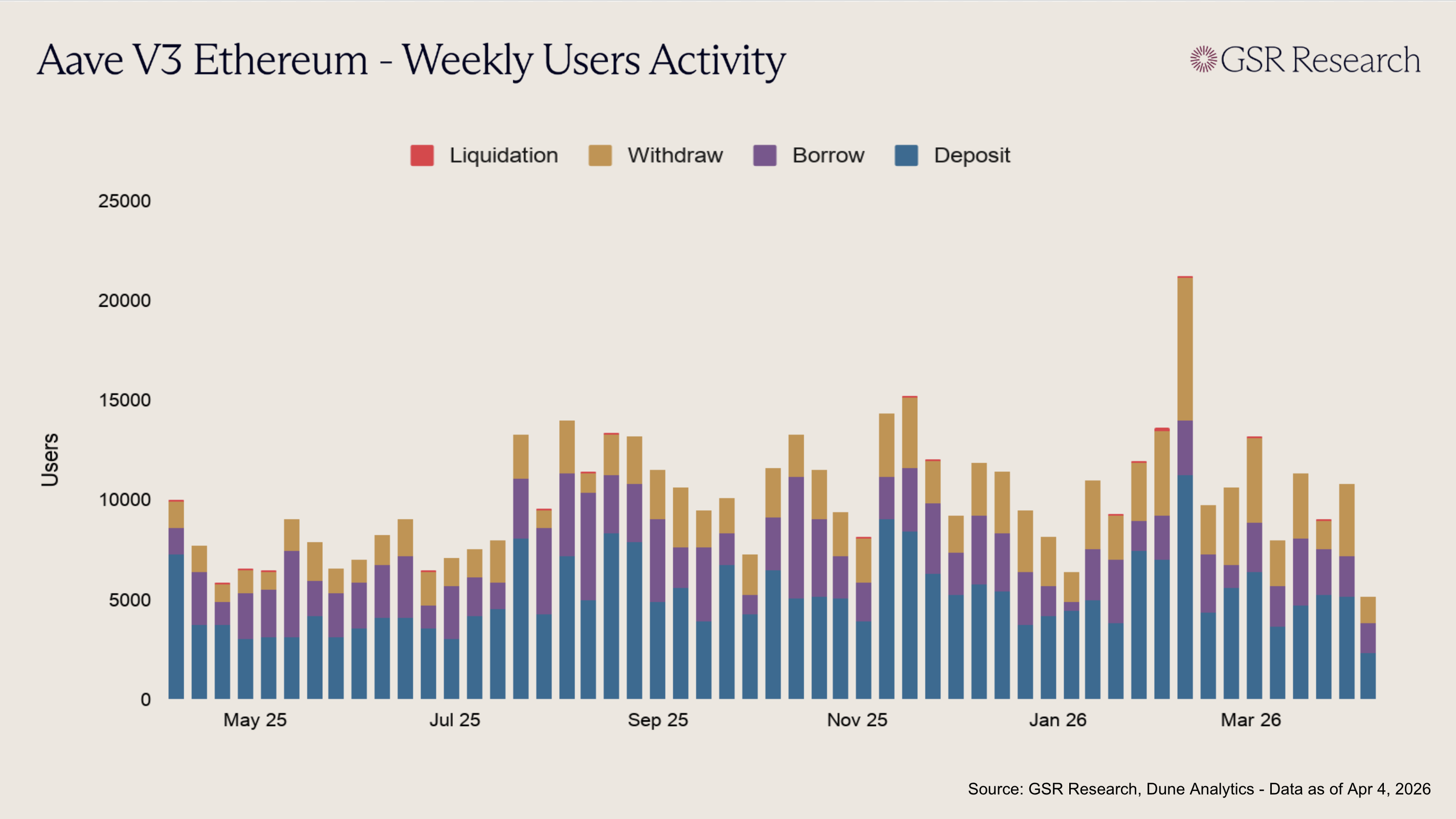 Historically, across Aave V3, depositors have made up about 51% of the weekly activity mix, borrowers around 26%, withdrawers about 23%, and liquidated users just 0.3%. However, the mix clearly turns more defensive during stress: the withdrawal share rose from roughly 18% in mid-2025 to about 29% in Q1 2026, with the biggest spikes clustering in early February alongside the highest liquidation counts. V4 should eventually tilt more toward borrow and withdraw activity as specialized spokes attract more strategy-heavy users, but the early data may still look deposit-heavy due to initial caps being so conservative. Over time, Position Managers and multicall should also smooth some of the manual withdrawal spikes, while the target-health-factor liquidation engine will further reduce liquidation activity on the margin by reducing over-liquidation.
