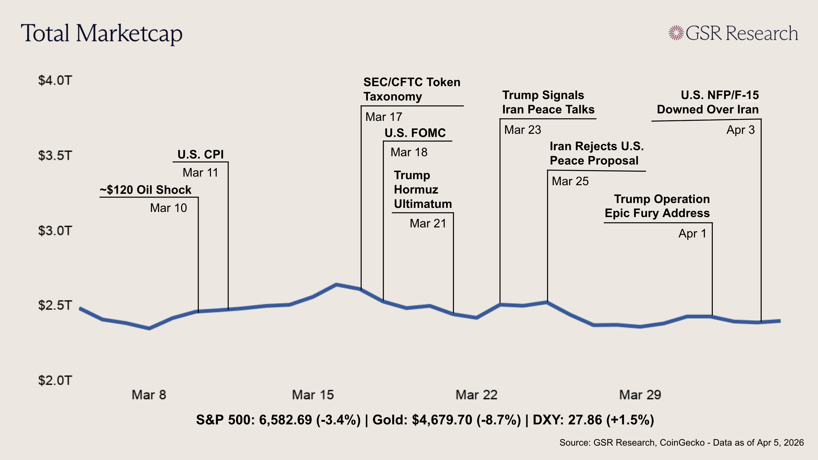 Crypto markets posted a modest bounce alongside equities as diplomatic optimism briefly took hold before giving way to renewed escalation. The total crypto market cap opened near $2.37T, and BTC initially held around $66,500 following two consecutive losing weeks. Sentiment shifted on Wednesday when Trump addressed the nation from the Oval Office suggesting the war could end within two to three weeks. Risk assets rallied in response, with the S&P 500 surging and BTC bouncing off its weekly lows. However, the optimism proved fleeting. Later that day Iran's IRGC threatened to attack U.S. tech companies operating in the Middle East, including Nvidia, Apple, Microsoft, and Google. By Thursday, Trump acknowledged the conflict would continue for weeks and signed a pair of Liberation Day anniversary tariffs, including tariffs on pharmaceuticals, steel, aluminum, and copper imports. Equities slumped in early trading before recovering intraday on reports that Tehran was working with Oman on a protocol to monitor ships through the Strait of Hormuz. On Saturday, Trump issued a fresh 48-hour ultimatum threatening to destroy Iran's power plants and bridges if the strait was not reopened by Tuesday. Iran's military dismissed the threat, and mediators from Pakistan, Turkey, and Egypt are now working to bring both sides to the table.