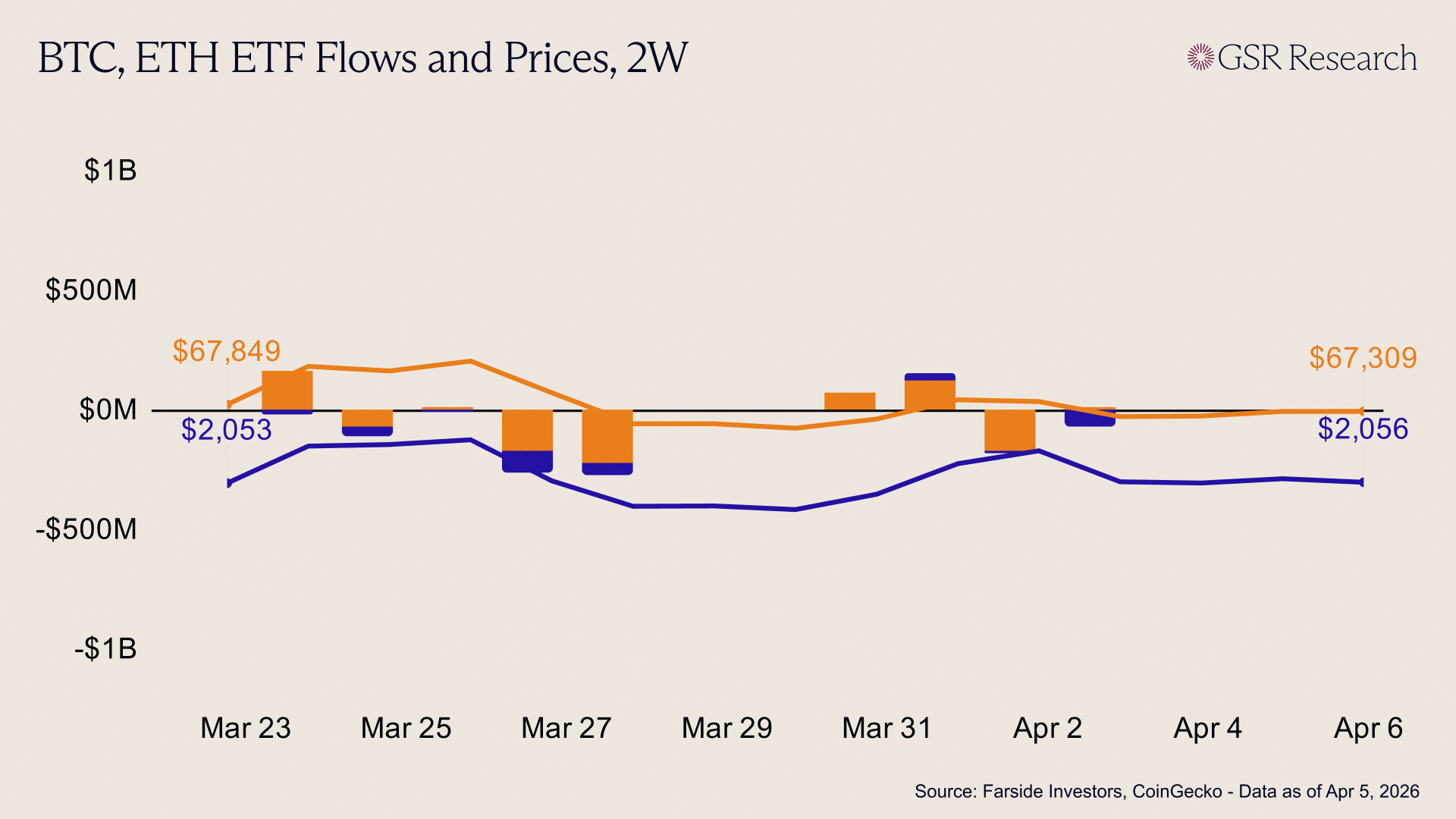 Overall, the majors remained largely range-bound throughout the week as the market entered a consolidation phase. Bitcoin traded flat from $66.7k to $67.3k (+0.9%), while Ether moved from $2,024 to $2,056 (+1.6%). Despite the intra-week push toward higher resistance levels, the inconsistent ETF tape suggests that institutional conviction remains cautious following the volatility of mid-March.
