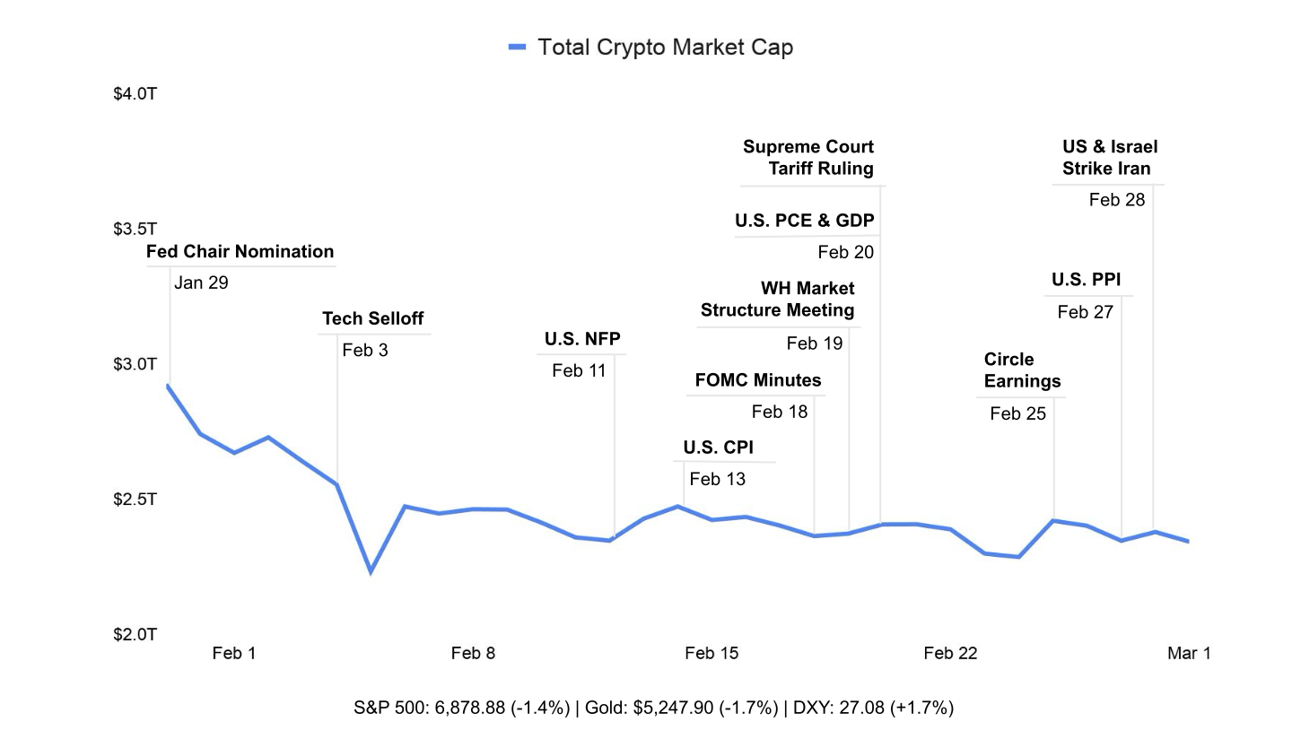 After a period of cautious consolidation, crypto markets experienced a volatile, but largely range-bound, final week of February, with a rally mid-week and a geopolitically-led correction over the weekend. The total market cap spent the early part of the week hovering near $2.3T before a decisive catalyst arrived on Wednesday. Many participants had anticipated volatility surrounding President Trump’s State of the Union address, but perhaps the larger driver of positive momentum was Circle’s blockbuster Q4 2025 earnings report, which acted as a powerful validation of the stablecoin-driven business model and sparked a broad-based recovery.