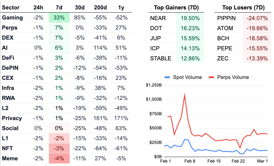 NEAR (+20%) was the top performer this week following its successful NearCon event in San Francisco, which included the reveal of several AI-related products and features, along with important protocol upgrades. The same cannot be said for Zcash (-13%), which is once again among the top losers. GSR has published 4 updates since we first debuted our weekly newsletter on February 9th, and while Zcash was a top performer for our second edition, the token was among the top losers for the other 3. The project has recently been undergoing a correction following its historic rally last year, and has lost momentum amid the ongoing governance uncertainty following the resignation of the core development team and their subsequent spin-out to launch the cashZ wallet.