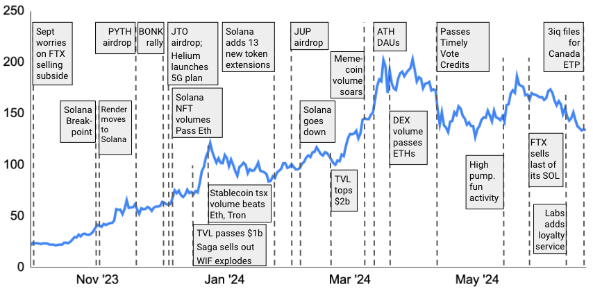 Founded in 2018 by Anatoly Yakovenko and Raj Gokal and launched in 2020, Solana is a delegated proof-of-stake blockchain built for performance and mass adoption. With ultra-cheap transaction costs, a wide array of decentralized applications, and bustling user and developer communities, it’s no wonder that Solana has amassed nearly 300 billion transactions and over $4 billion in total value locked. Moreover, Solana continues to distance itself from the pack, with recent highlights including a plethora of high-profile token launches, various project migrations to Solana, the release of key innovations like token extensions, and a flurry of activity around use cases only possible on Solana, including order books, bulk NFTs, DePINs, memecoins, and more.