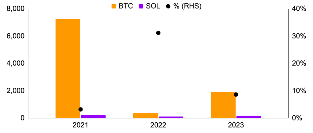 BTC and SOL: Global Investment Product Inflows, $m, 2021-2023