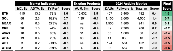 Adding together our Decentralization and Demand Scores gives us a final ETF Possibility Score. Note that we weight decentralization 33% and demand 67%, as we believe decentralization may be more of a gating factor, while potential demand will likely be the main criteria used by issuers. Overall, Ethereum, which had pivotal spot ETH ETF 19b-4 filings approved in May and is expected to see multiple spot ETFs launched this summer, came in first place by a wide margin. Next is Solana, which also outpaced the next closest digital asset by a large margin and was the only other besides Ethereum to have positive scores for both decentralization and demand. Rounding out third place is NEAR due to decent performance across both categories. All in, the results clearly suggest that Solana is next, should additional spot digital asset ETFs be permitted in the US.