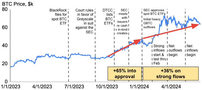To assess the impact of a potential spot Solana ETF on the price of SOL, we can simply turn to the impact the spot Bitcoin ETFs had on Bitcoin. After all, the approval of the spot Bitcoin ETFs and subsequent exceptional inflows has been the overwhelming factor moving Bitcoin from $27,000 in October when market participants began to ascribe a real possibility of a spot ETF approval in the US to ~$63,000 now, for a 2.3x increase. This 2.3x will be our baseline.