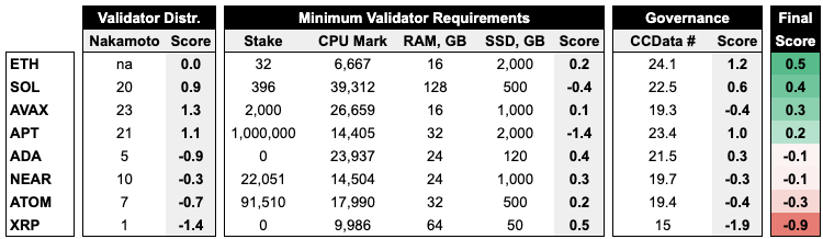 In what follows, we provide brief analyses attempting to quantitatively determine both a Decentralization Score and a Demand Score before adding them to form an ETF Possibility score. Note that we convert the various category metrics into Z-scores to enable combining categories, before taking a simple average of each category’s Z-score to compute the final Decentralization and Demand Scores. Finally, note that many metrics used have flaws and some level of subjectivity, though we believe are still informative for the task at hand. So without further ado…