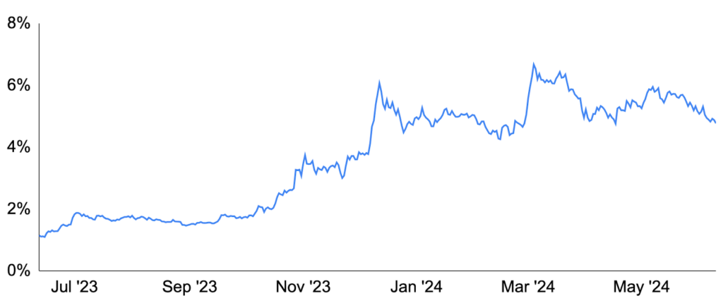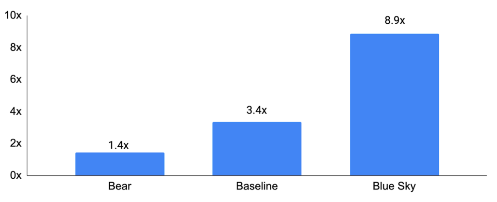 Blue Sky: Solana’s relative inflows have been much higher in the last two years, representing 31% and 9% of Bitcoin inflows in 2022 and 2023, respectively. While we would not expect Solana to fully keep pace with periods of exceptional Bitcoin inflows such as in 2021 and 2024, we view the 14% average annual relative inflow over the three years as the potential blue sky scenario.