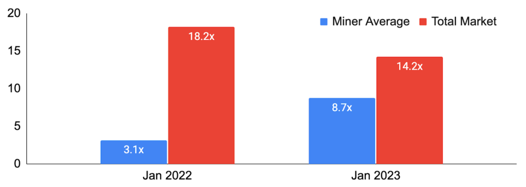 Source: B Riley, NYU/Damodaran, GSR. Note: Excludes negative valuation multiples. Miner average is composed of RIOT, MARA, SDIG, and GREE and uses forward EBITDA based on the current bitcoin price at the time. We show January 2022 and 2023 as we believe they are indicative of through-the-cycle valuation multiples. The constituents for miner consensus estimates have very high dispersion, and as such, we use estimates from B Riley, which we believe are particularly well modeled.