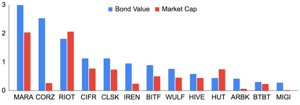 Miners Valued as Bonds vs. Current Market Caps, $b