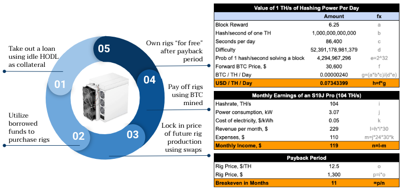 As an example, an S19J Pro (104 TH/s) is currently selling for around $12.50 per TH. Using the current network difficulty, a $0.05 / kWh electricity cost, and a $30,000 bitcoin price, a simplified calculation puts the payback period of the rig at 11 months. Adding in interest cost, and the earnings from the rig, which are now more certain given a fixed bitcoin price, fully pays off the loan that was used to purchase the rig over the one-year life of the loan. Thus, in a year the miner will be in the same state it started in (no debt, same HODL), but will own an additional rig.