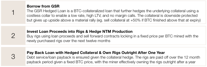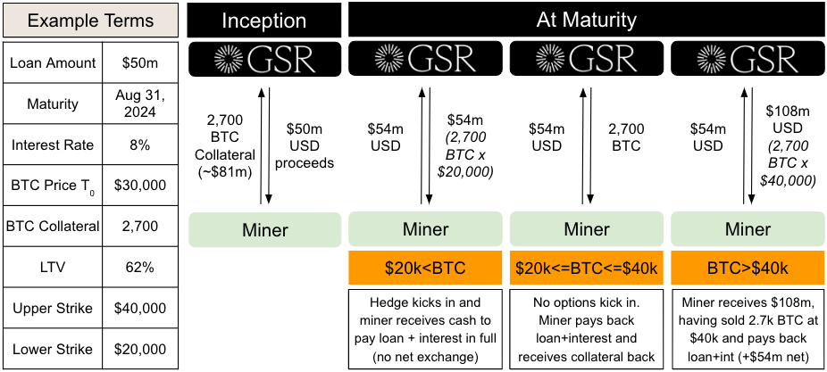 The GSR Hedged Loan puts a twist on typical bitcoin-backed loans by adding a costless collar to protect the collateral, ensure loan payback, and enable a rock-bottom interest rate. In effect, the collateral hedge provides “optionality”, protecting the miner if bitcoin falls below the lower strike in exchange for giving up some of the upside upon a very material rally. Other significant benefits versus a traditional loan include a relatively high loan-to-value, no margin calls, and advantaged tax treatment. In addition, loan terms are customizable, so loan pricing and upper/lower strikes can be changed depending on miner goals.