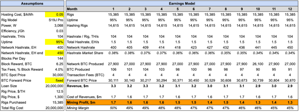 Adding in numbers and modeling out more fully compared to the simple payback period calculation above, a miner with 1,700 BTC in idle HODL worth about $50m can use a portion of it as collateral to take out a $20m loan. The miner may then purchase ~15,400 S19J Pros (104 TH/s) for $12.50 / TH or $1,300 each. The miner can then use the remaining HODL as collateral to sell forward the bitcoin it expects to mine with the newly purchased rigs to fix the price it sells its production for in the future, effectively locking in the cash flows to pay off the loan and allowing the miner to own the rigs outright after the payback period. Note that given current economics, a 15-month loan / 15 months of operating the rigs are required to pay back the loan and own the rigs in full, though this return period may be longer or shorter depending on miner-specific inputs like electricity cost and variables when it is initiated like the price of bitcoin.